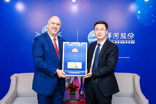洋河股份黨委書(shū)記、董事長(zhǎng),雙溝酒業(yè)董事長(zhǎng)張聯(lián)東(右)向古巴駐華大使